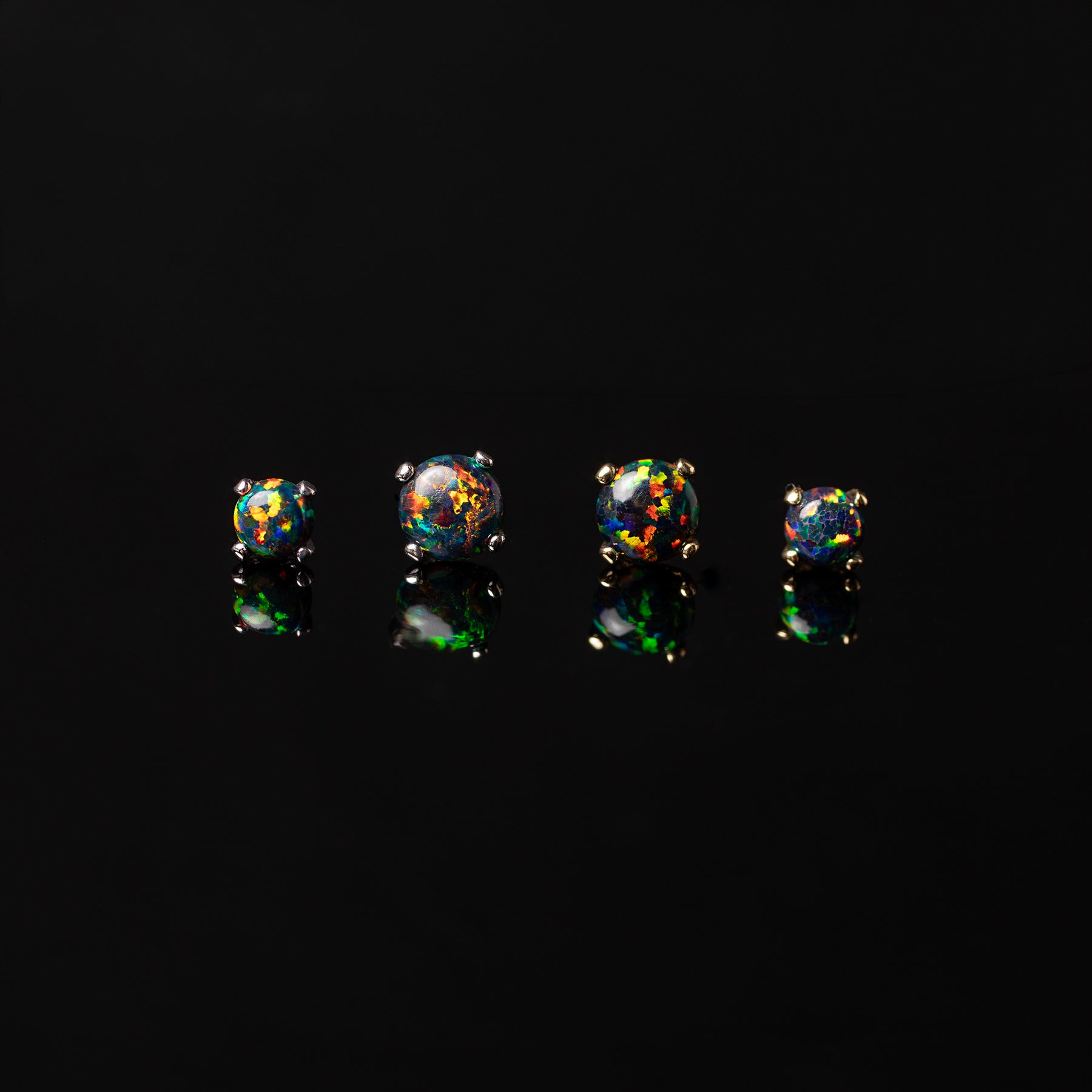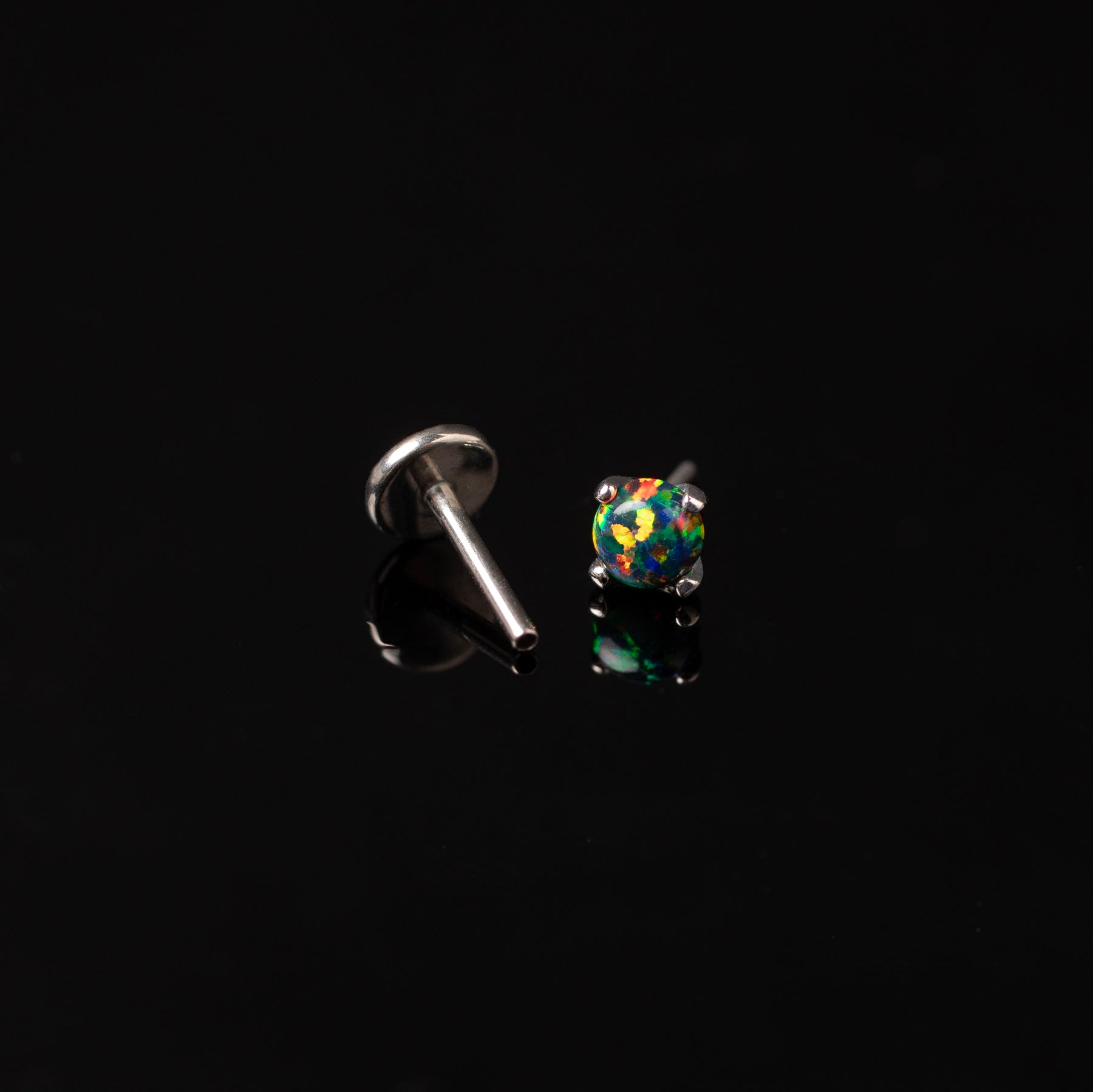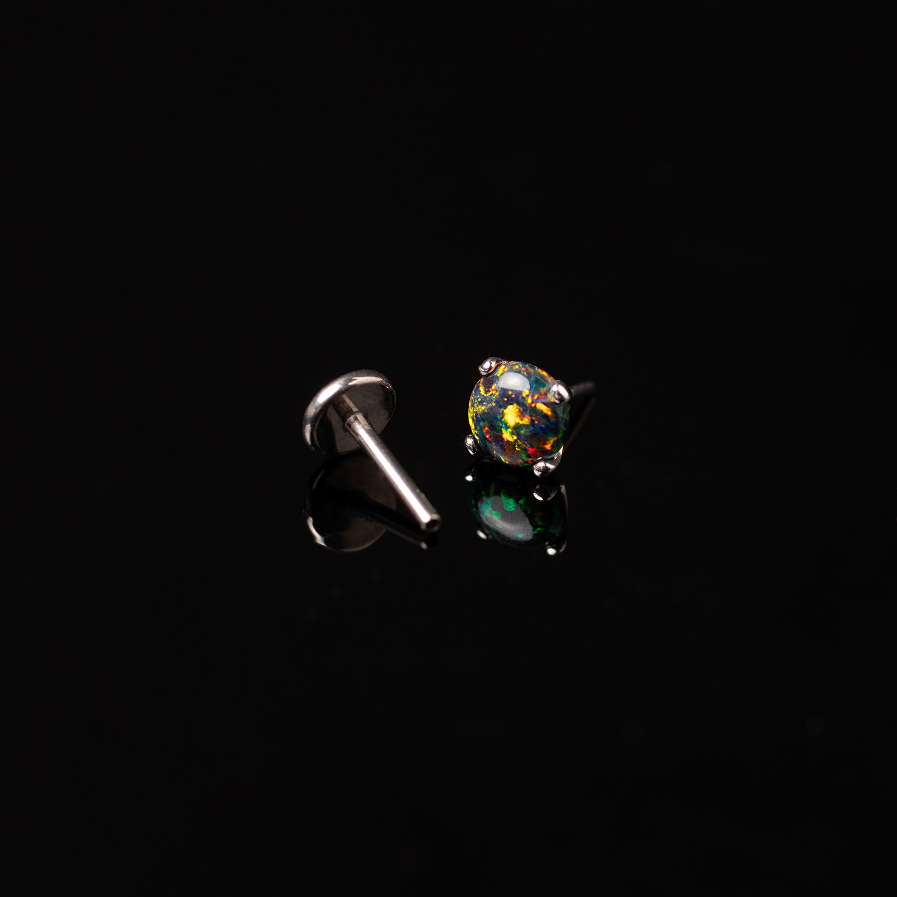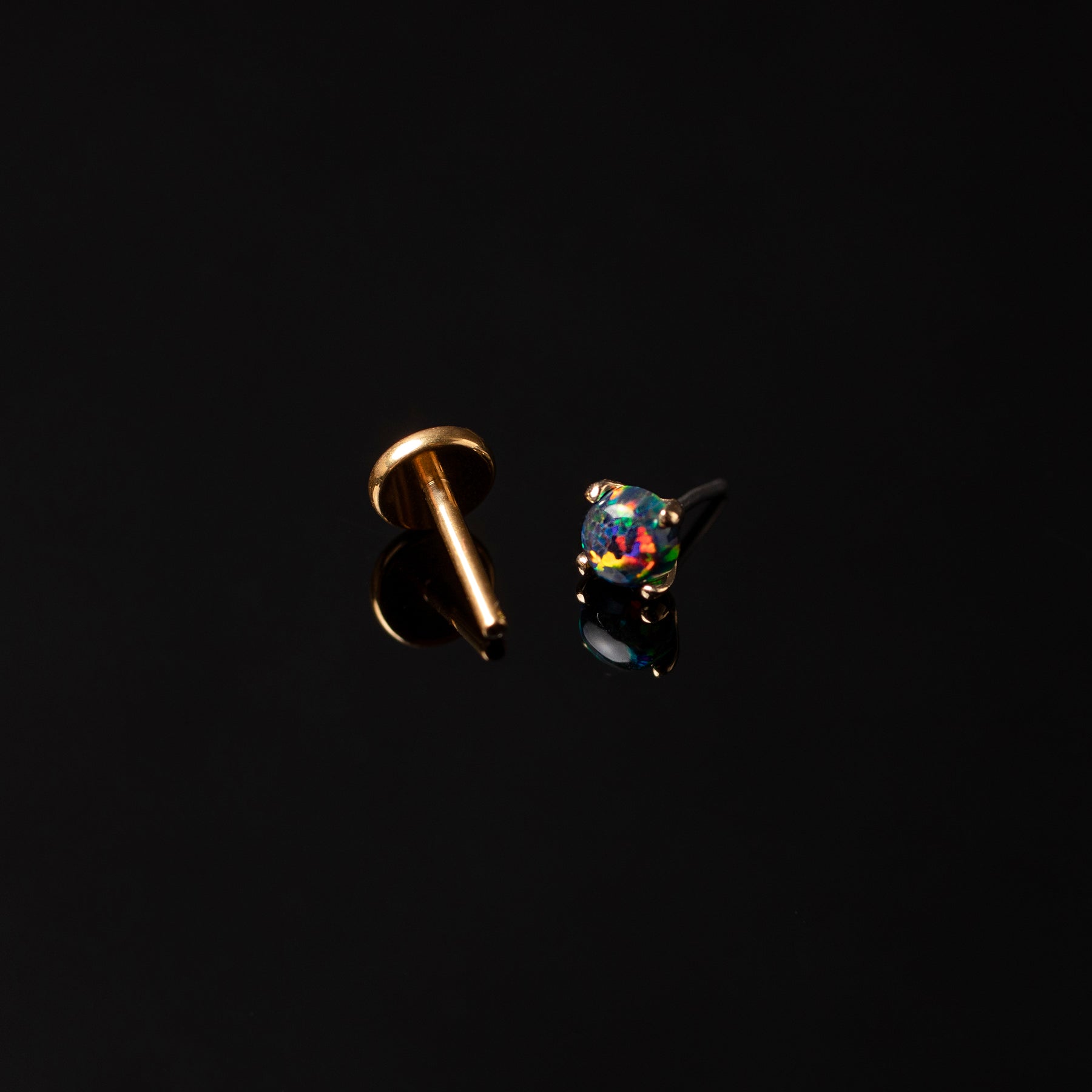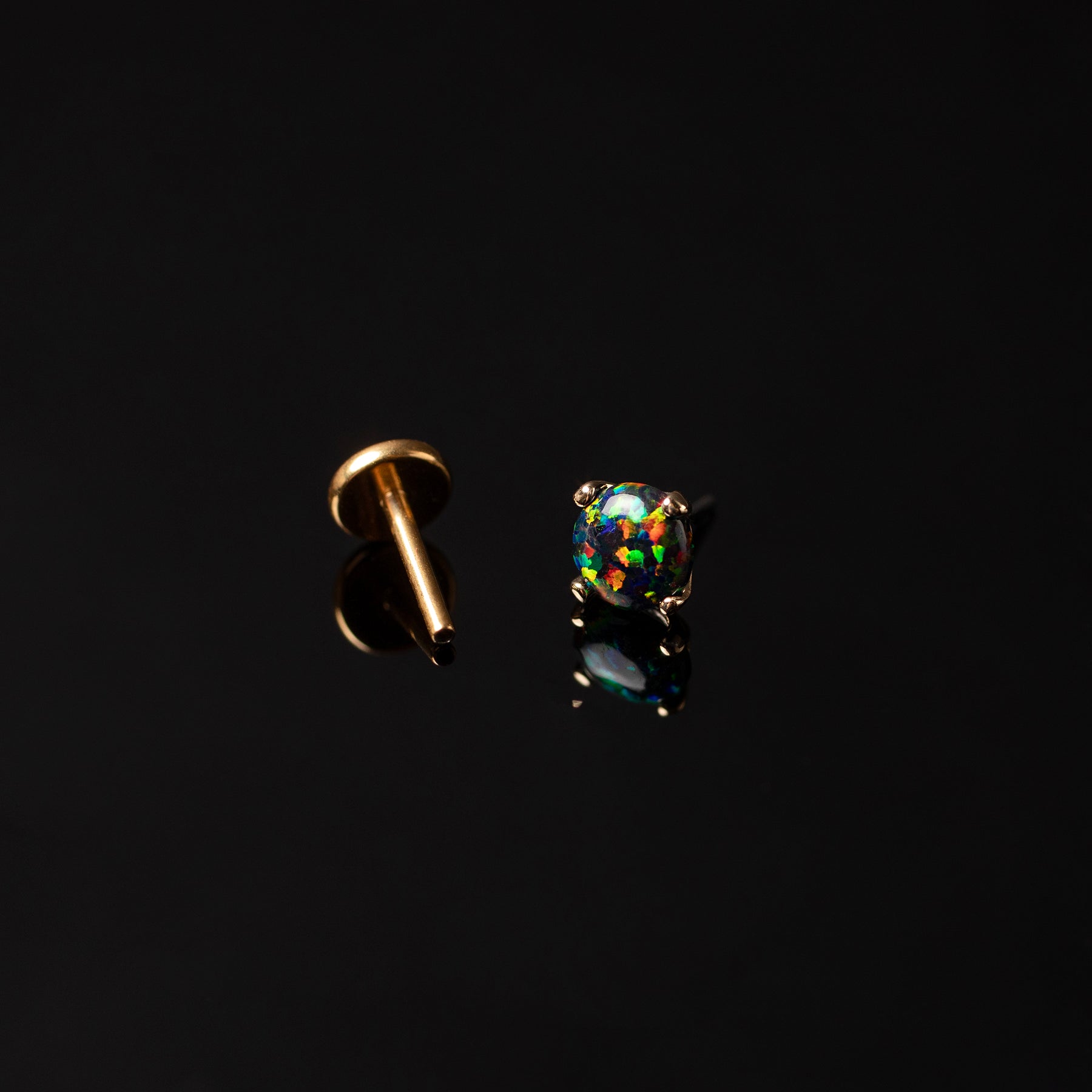 • 14 karat solid gold flat back front post, ASTM F136 implant-grade titanium sleeper flat back, Bello black opal